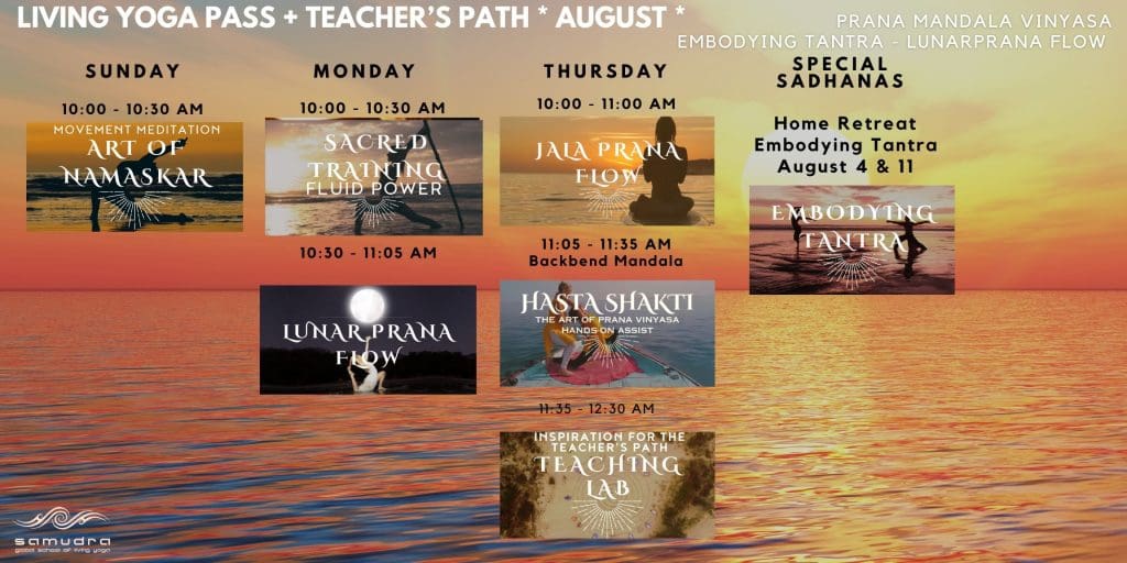 - 10:00 am – Art of Namaskar: Discover the transformative power of sacred movement. Energize your body and calm your mind for the week ahead.